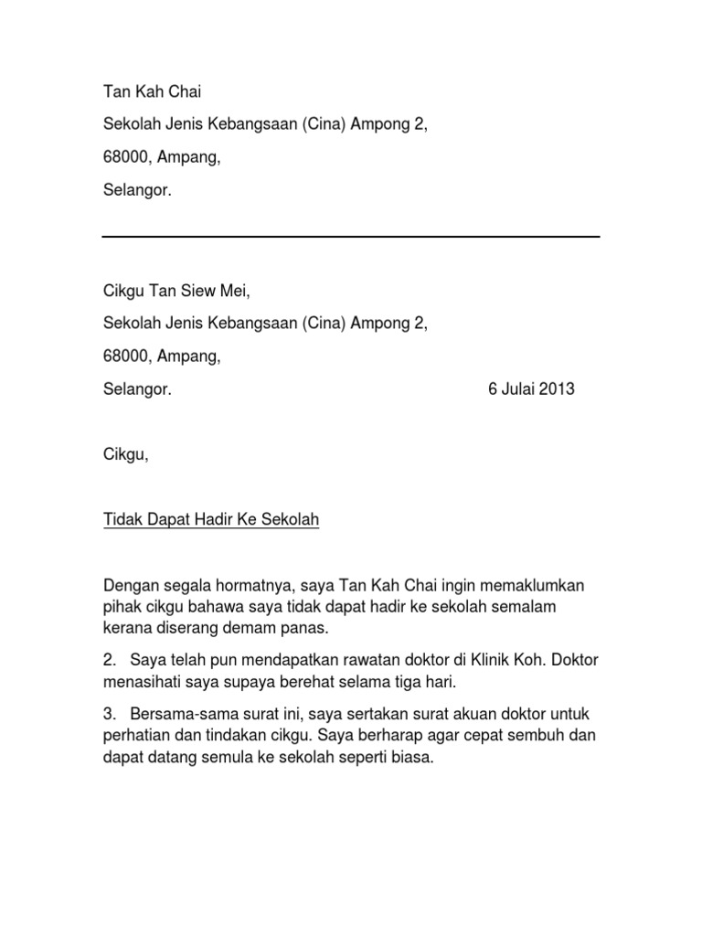 Contoh Surat Anak Tidak Dapat Hadir Ke Sekolah Kerana Demam Learn English School School S