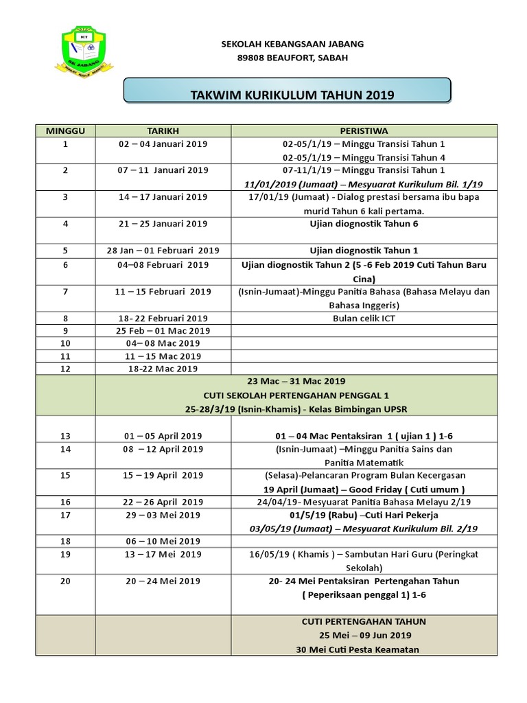 Takwim Kurikulum Tahun 2019 11 01 2019 Jumaat Mesyuarat Kurikulum Bil 1 19