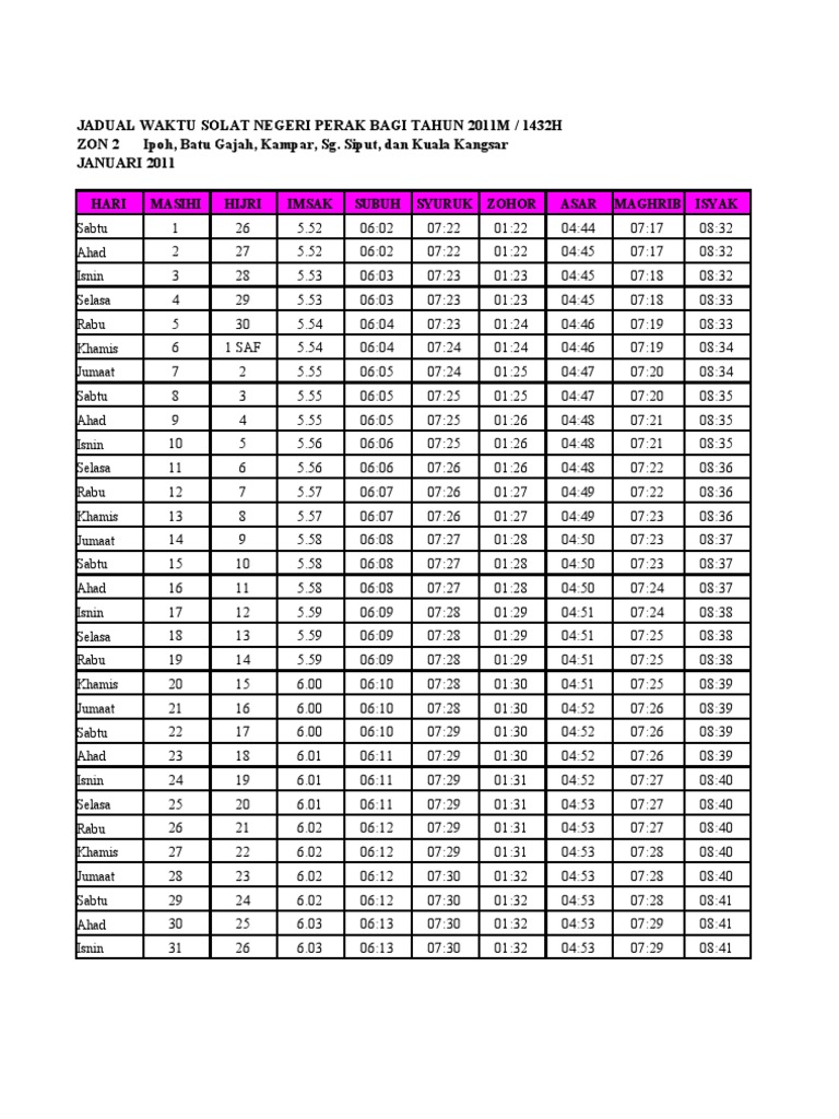 Jadual Waktu Solat Negeri Perak Bagi Tahun 2011m 1432h Zon 2 Ipoh Batu Gajah Kampar Sg Siput Dan Kuala Kangsar Januari 2011